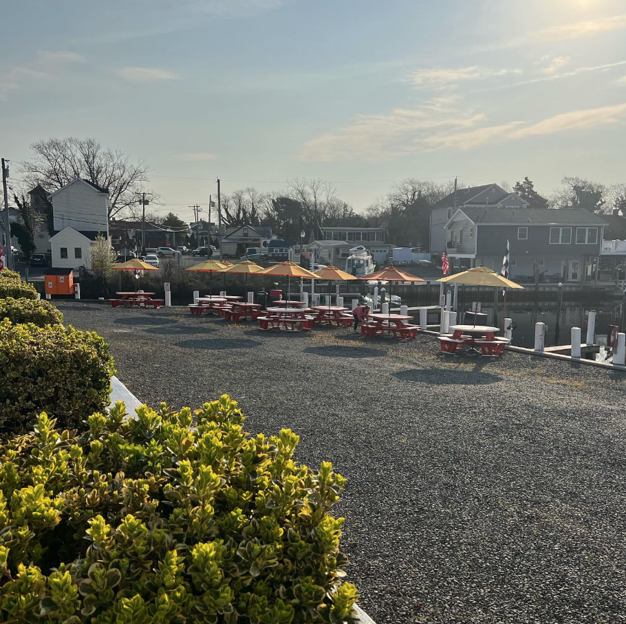 Dock-and-dine by boat, picnic tables with Tuckerton Creek views, live music some nights.